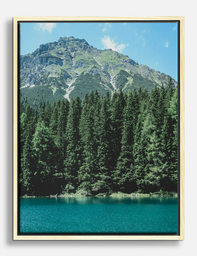 A wall can be your window to wonder. Cool blue waters, majestic evergreens, and a towering mountain create a scene that instantly grounds and refreshes your space. Imagine unwinding at home as this peaceful landscape brings nature’s calm right into your living room or bedroom.