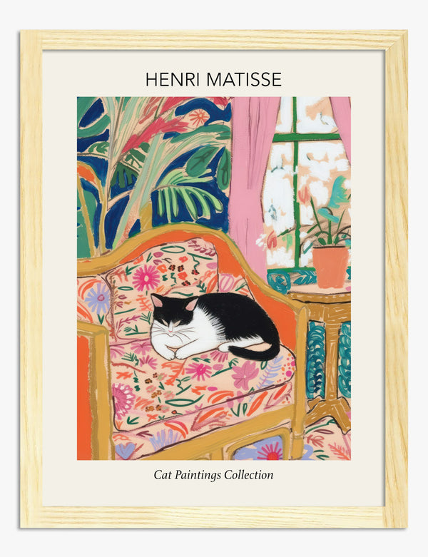 Affiche chat noir et blanc sur chaise fleurie, esprit Matisse