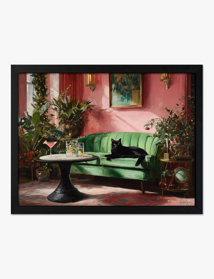 A black cat sprawled on a lush green sofa? That’s pure confidence—and your space deserves it. This scene radiates easy glamour, with pops of emerald and playful pinks that instantly energize your room. Let your living room or bedroom become a statement of effortless style. The mix of vibrant plants, a retro cocktail, and bold color-blocked walls creates a vibe that’s welcoming, lively, and totally unique to you. You’ll love how this piece adds a touch of personality and comfort—making every guest wish their space felt this inviting. Affordable, accessible, and brimming with charm, it’s the perfect way to show off your style (and maybe your love for a little feline mischief).