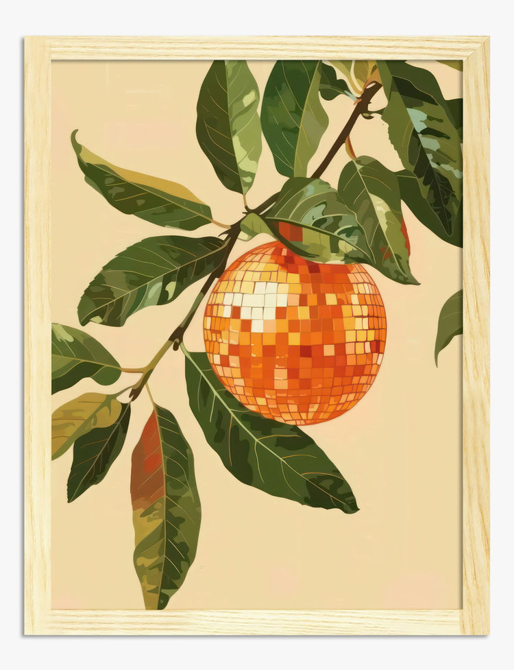 Who says fruit can’t bring the party? This playful print spotlights a shimmering orange transformed into a disco ball, hanging lush among vibrant green leaves. It’s a fresh twist on botanical art—bold, unexpected, and full of personality.