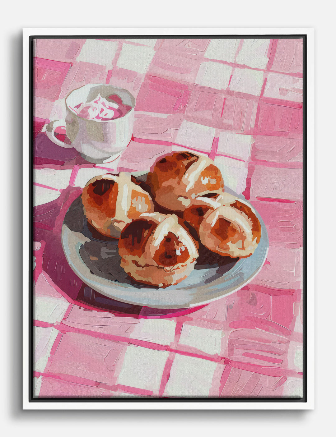 Warm, golden buns and a swirl of creamy coffee—this piece brings the cozy charm of a Sunday brunch right into your kitchen. The playful pink checks and glossy treats add a pop of joy that instantly brightens your space.