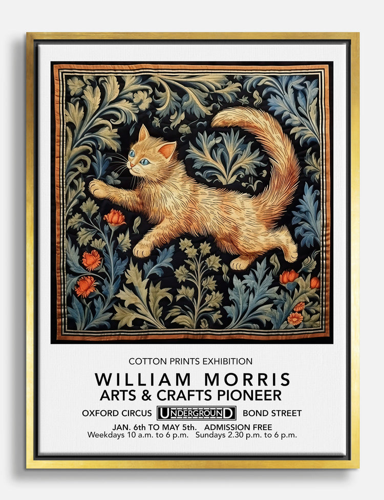 A curious orange cat tumbles through a lush tapestry of swirling leaves and blooms, bringing a sense of playfulness and warmth to your space. This William Morris-inspired piece is perfect for anyone who loves vintage charm with a touch of whimsy. Let it add a cozy, storybook vibe to your living room or bedroom—its rich golds and deep blues pop against both modern and traditional decor. You’ll feel proud to show off this unique print that celebrates your love for art, nature, and a dash of feline mischief.