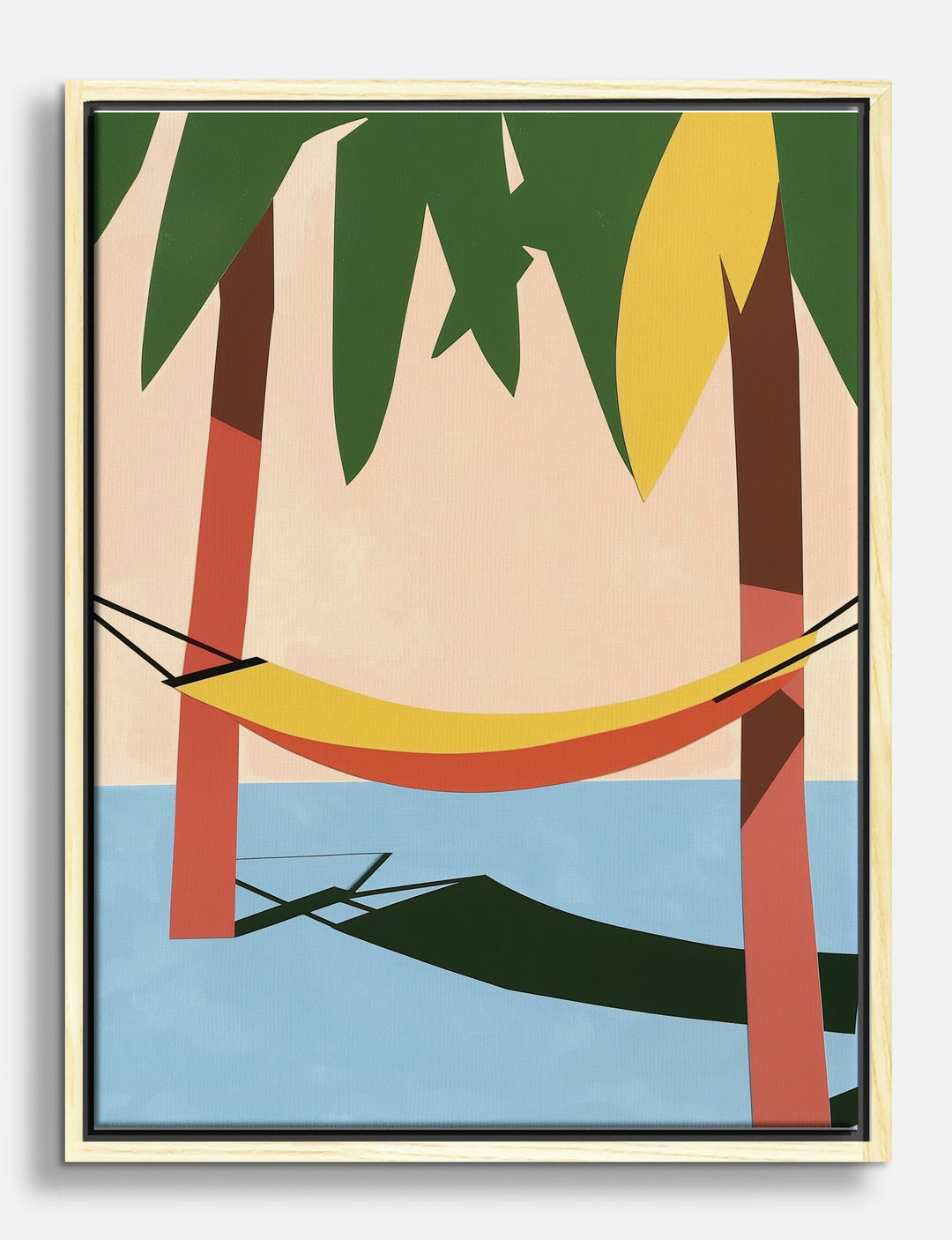 Feel the gentle sway of relaxation with this vibrant piece. The colorful hammock nestled between palm trees transports you to a serene coastal escape, perfect for adding a touch of paradise to your living room or bedroom. Its warm hues effortlessly blend with various decor styles, bringing a sense of tranquility and joy to your space. Transform your home into a personal oasis with this unique, affordable artwork.