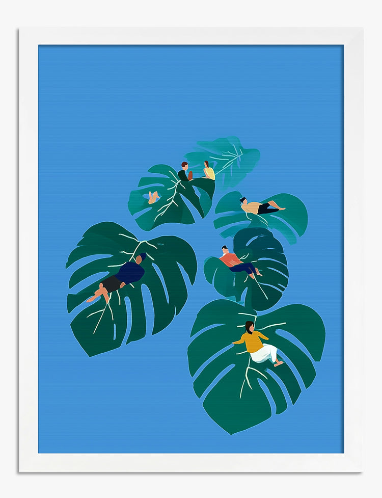 Envie de flotter au-dessus du quotidien ? Cette affiche ludique donne vie à ce rêve éveillé : de petits personnages se détendent et explorent sur des feuilles de monstera luxuriantes, sous un ciel bleu serein. À chaque regard, elle offre une petite échappée et beaucoup d'imagination. Parfaite pour stimuler la créativité ou simplement se détendre après une longue journée.