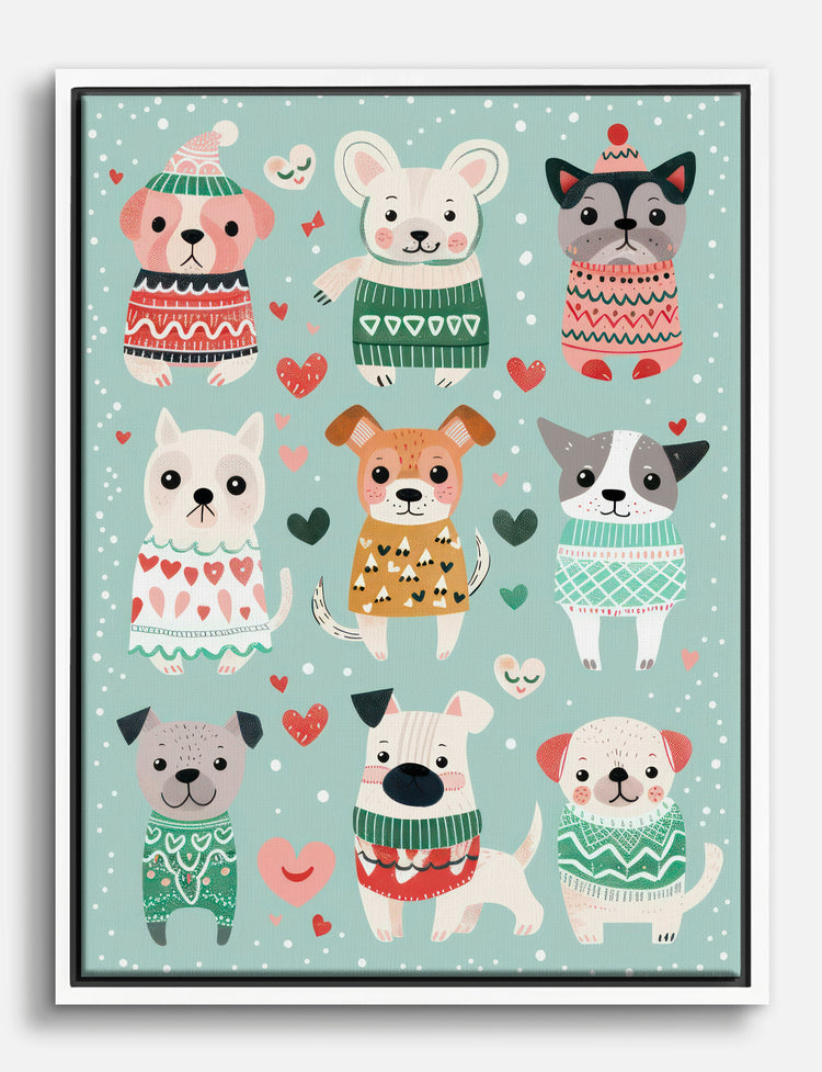 Looking for a daily dose of joy? These charming pups in their whimsical winter sweaters bring instant warmth and cheer to any space. Every detail pops with playful color, making it perfect for sparking smiles in your nursery or kids’ room.