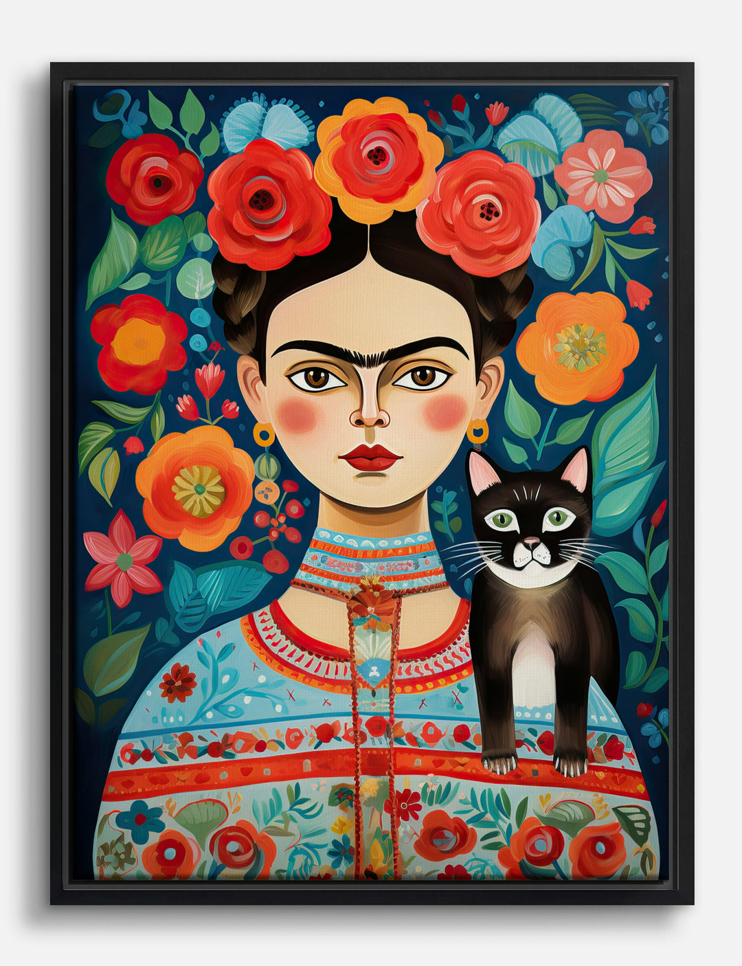 Vivid blooms and bold spirit greet you in this striking portrait inspired by Frida Kahlo. The lush flowers and vibrant colors instantly energize your walls, while the confident gaze brings a sense of empowerment to your space.