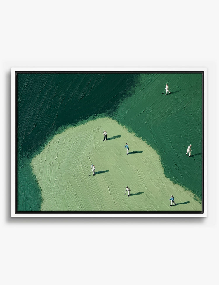 Bird’s-eye brilliance meets playful calm in this striking piece. From above, golfers become tiny explorers on a lush, abstract green—inviting you to see everyday leisure through a fresh lens. Let this artwork energize your living room or office with its soothing greens and bold, graphic shapes. Its minimalist palette pops against both light and dark walls, making it a confident choice for any decor style. You’ll love how it sparks curiosity and conversation, while adding a touch of modern sophistication. Effortlessly transform your space—no golf skills required.