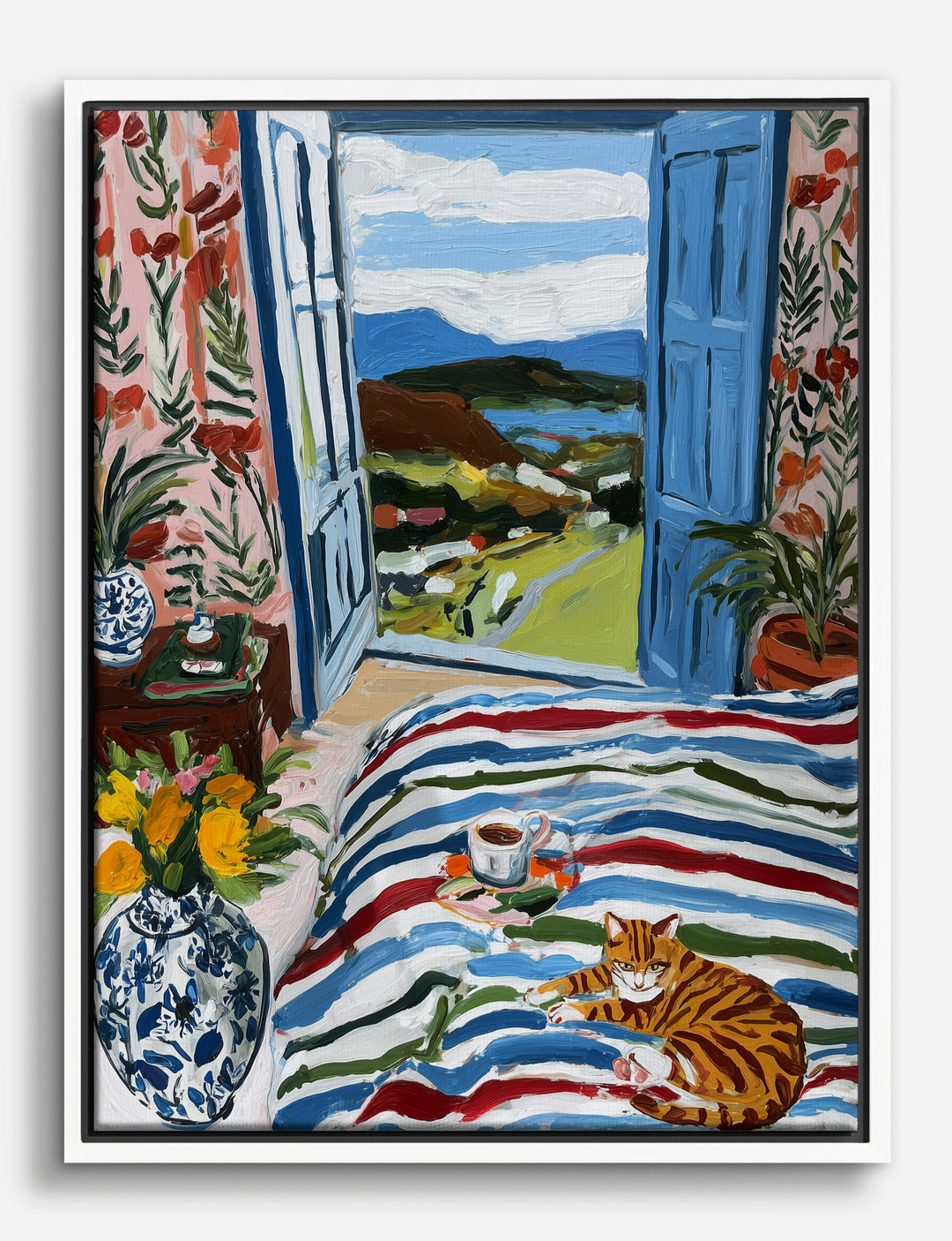 Start your day with a burst of color and calm—this artful scene is like an open invitation to linger in bed just a little longer. Bold blue shutters frame a sun-soaked landscape, while a cozy tabby cat and a striped blanket add a playful touch of comfort and whimsy.