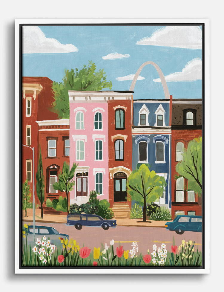 A pastel-hued stroll through St. Louis, right on your wall. This charming cityscape instantly energizes your room with its playful pinks, cool blues, and that unmistakable arch in the background.