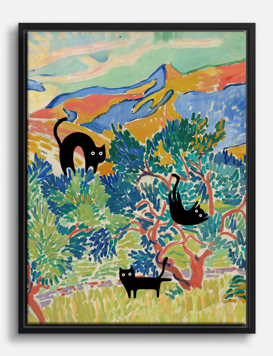 Bold color meets pure whimsy in this vibrant nod to Derain’s Fauvist spirit. Three curious black cats frolic among lively trees and sunlit hills, bringing joy and movement to any space. Hang it in your living room or bedroom to spark conversation and let your style shine. The dynamic palette pops against modern or eclectic decor, proving that great taste is always within reach. You’ll feel uplifted every time you catch a glimpse—your walls just found their happy place.