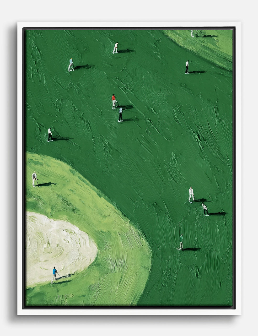 Theres a sense of effortless movement in this lush, painterly golf course, where tiny figures wander across sweeping green strokes. Whether youre a fan of the game or simply love the look of open spaces, this piece brings a playful, relaxed energy to your home.
