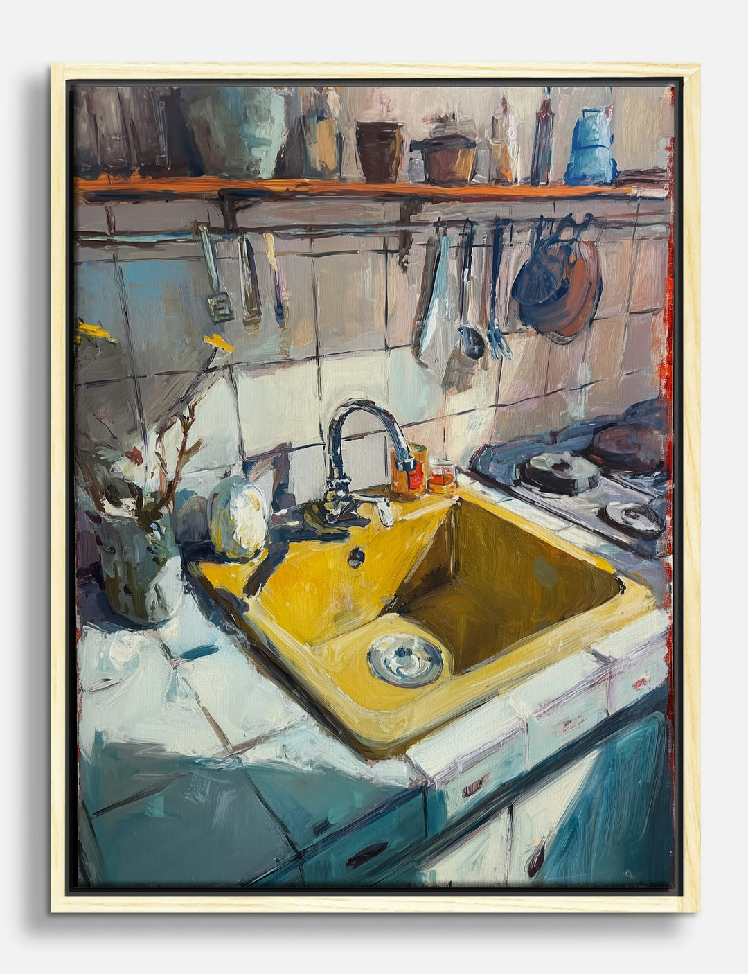 A burst of vintage charm, right in the heart of your home. Soft sunlight spills over a cheerful yellow sink, inviting you to pause and savor the beauty in everyday moments. This piece radiates warmth and nostalgia, turning even the most ordinary corner into a slice of retro-cool style.