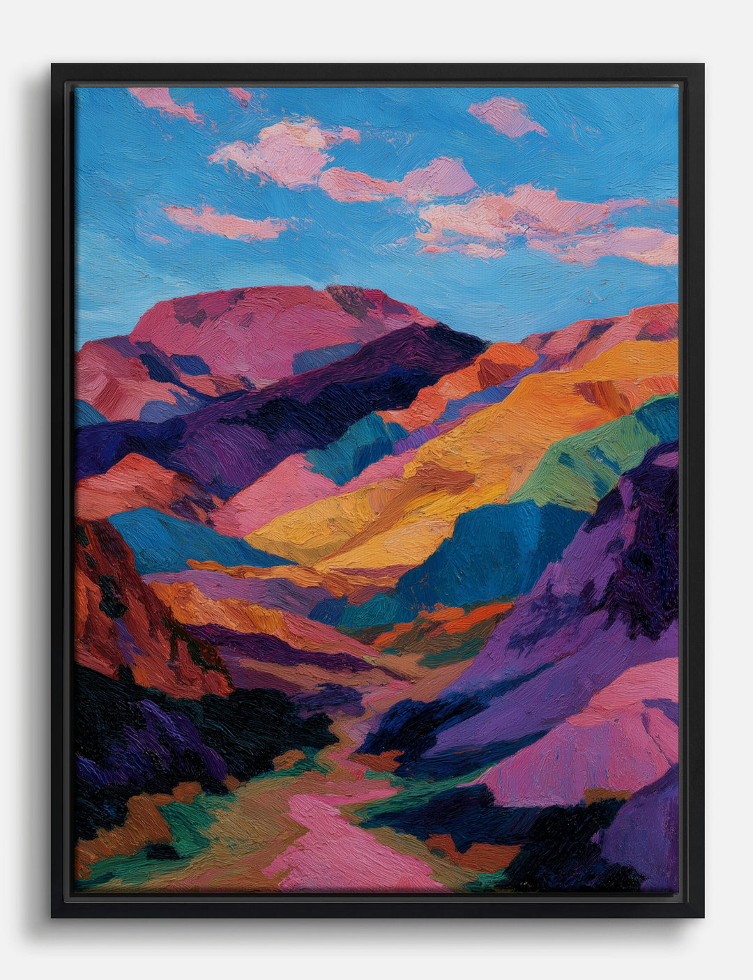 Bold color meets wild imagination. This landscape pulses with energy, painting your walls in rich magentas, golds, and blues that instantly spark joy.