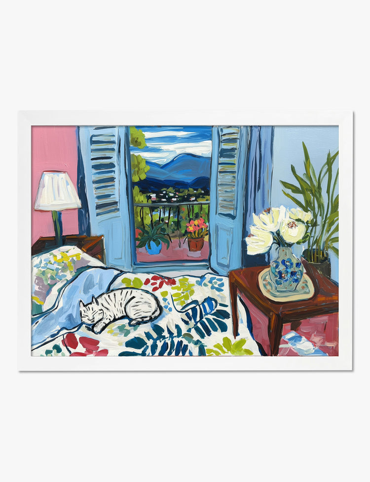 Wake up to a world bursting with color and charm — this artwork turns every morning into a mini getaway. A cozy bedroom scene, lush with leafy patterns and a contented cat, spills out to a sunlit terrace and rolling blue hills beyond. You’ll love how the playful palette of blues, greens, and pops of floral red brings instant personality to your space, making it feel both welcoming and uniquely yours. Its a piece that softens bedrooms and reading nooks, but don’t be surprised if it becomes your favorite conversation starter in the living room. Perfect for anyone who wants their home to feel joyful, lived-in, and effortlessly stylish. With this print, you’re not just decorating — you’re telling your own story, one vibrant detail at a time.