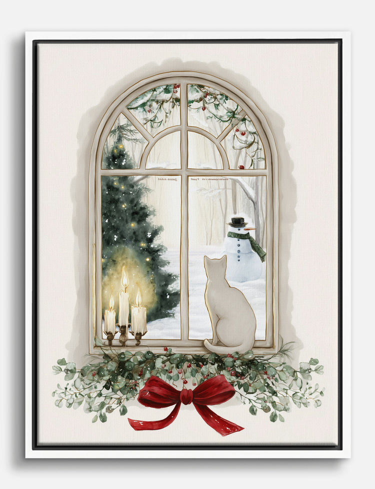 A gentle hush falls over your space with this enchanting winter vignette. Soft candlelight flickers beside a curious cat, both drawn to the snowy world just outside the window—where a cheerful snowman and twinkling tree await.