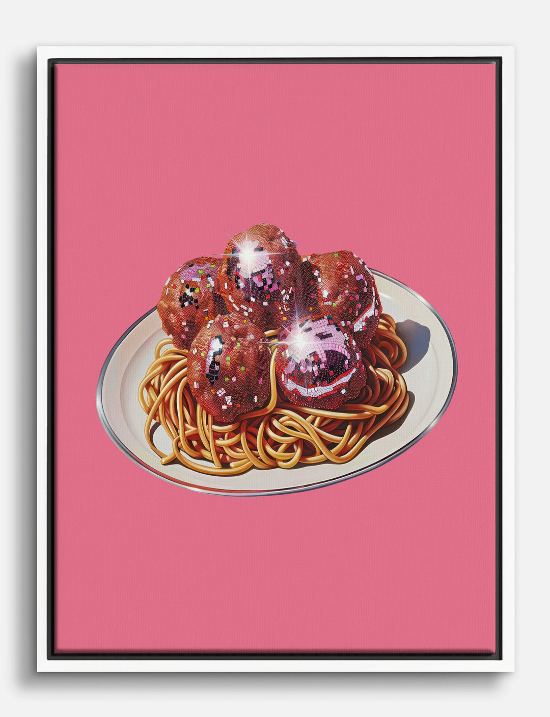Who says dinner can’t sparkle? This playful piece brings a burst of joy and a dash of disco right to your kitchen or dining nook. The glossy, glittering meatballs and swirling spaghetti pop against a radiant pink backdrop, instantly brightening your space with a wink of whimsy.