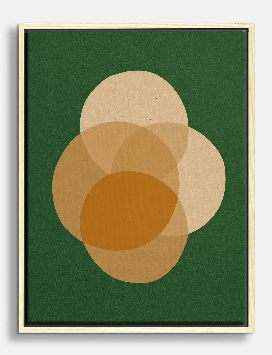 Warm neutrals and soft curves come together in this cozy, modern piece. Layered circles in rich ochre and gentle beige pop against a deep green backdrop, creating instant visual interest without overwhelming your space.