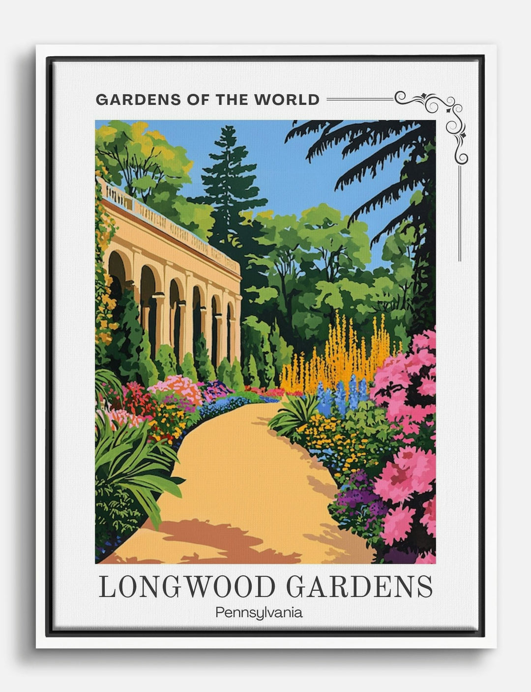 Step into a world of vibrant blooms and lush greenery with this captivating piece. Perfect for your living room or office, the artwork brings the elegance of Longwood Gardens right into your home. The rich colors and serene path invite a sense of peace and joy, effortlessly complementing any decor style. Let this piece transform your space into a sanctuary of beauty and inspiration.