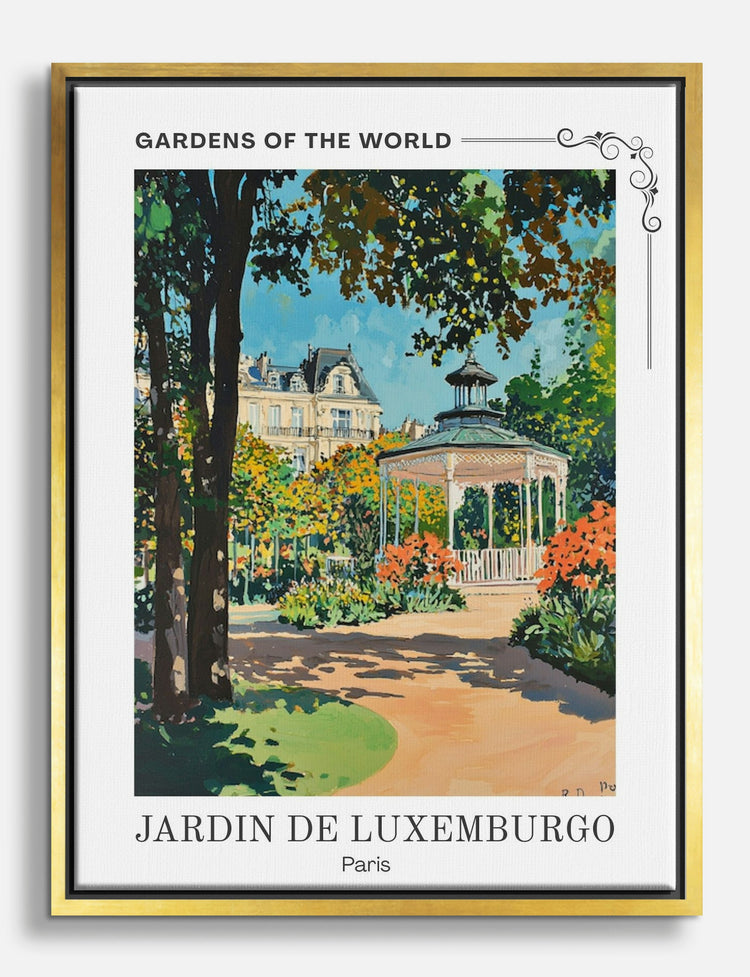 Step into a serene escape with this enchanting depiction of Jardin de Luxemburgo in Paris. The vibrant colors and charming gazebo invite you to transform your space into a haven of tranquility and elegance. Perfect for your living room or bedroom, this piece effortlessly complements both classic and modern decor, adding a touch of Parisian romance to your home. Let this artwork inspire pride and joy in your personal sanctuary.
