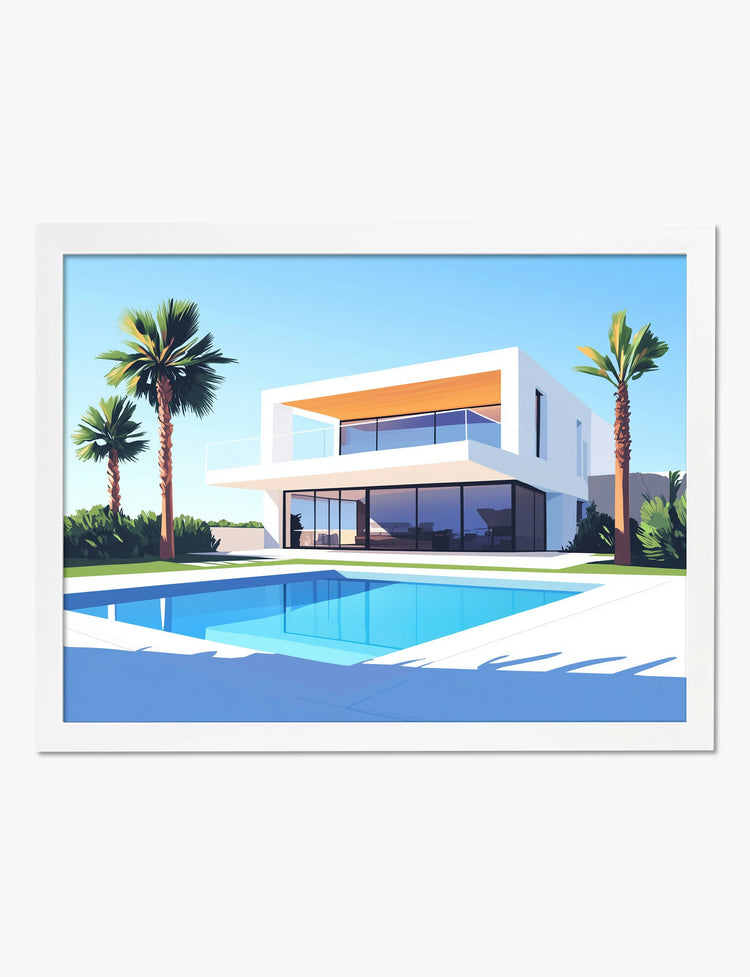Bold lines and bright skies set the stage for your next style upgrade. This crisp, sunlit scene of a mid-century modern home and pool brings instant sophistication and vacation vibes to your walls. Let the clean architecture and tropical palms transport you—without ever leaving your living room. The cool blues and fresh whites pop against any decor, making it a stunning standout or a subtle complement. Perfect for spaces where you want to spark inspiration and relaxation—think living room, office, or even a serene bedroom. With this piece, your home feels like a getaway, every single day. You deserve a space that feels as fresh and inviting as this view. Let your walls reflect your love for modern comfort and effortless style.