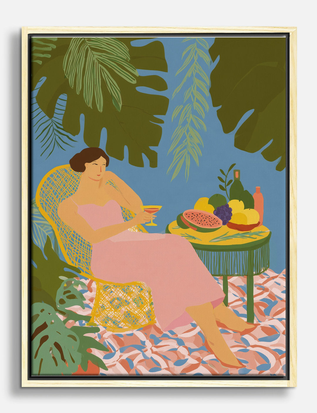 A quiet afternoon, a chilled drink in hand, and a world of lush greenery—this piece brings effortless relaxation right into your home. The soothing blues and leafy greens set a tranquil vibe, while the soft pinks invite warmth and comfort.