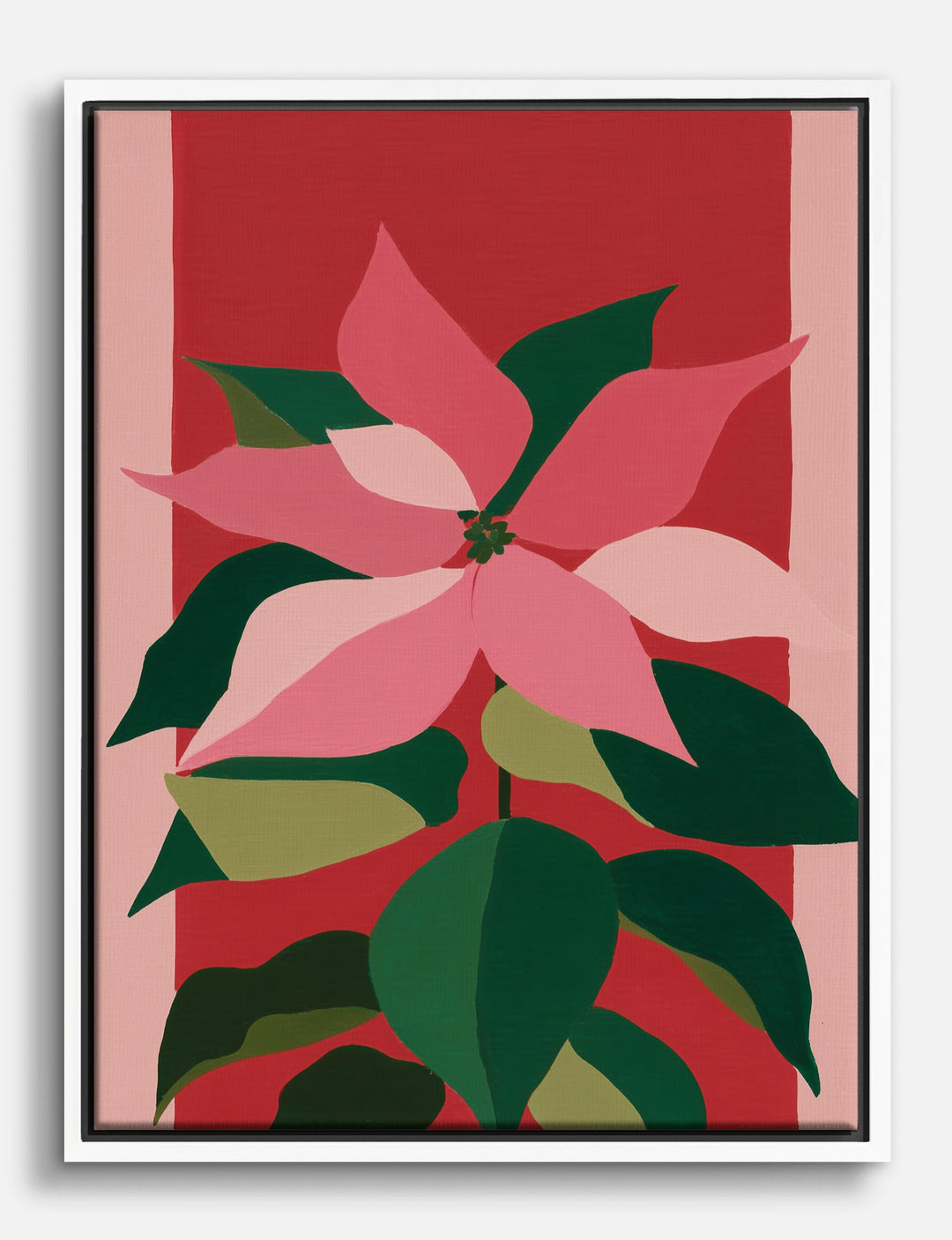 Bold color, big impact—this striking botanical brings a fresh spark to your space. The stylized pink poinsettia, set against rich reds and earthy greens, feels like a burst of winter cheer that lasts all year long.