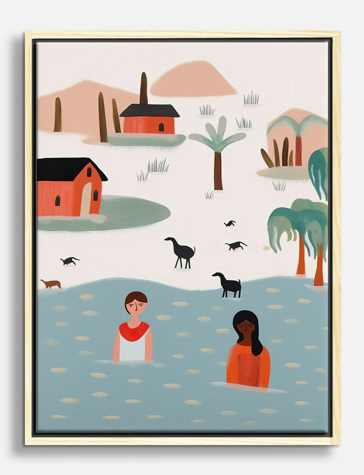 Cool, tranquil waters meet the warmth of a sun-soaked village in this playful, heartwarming scene. Two figures wade peacefully as quirky animals and cozy houses dot the dreamy landscape behind them. You’ll love how the soft corals, teals, and earthy tones instantly brighten up your living room or bedroom, making every day feel a little more carefree and connected. With its unique blend of charm and calm, this piece brings a touch of joy and effortless style to your favorite retreat.