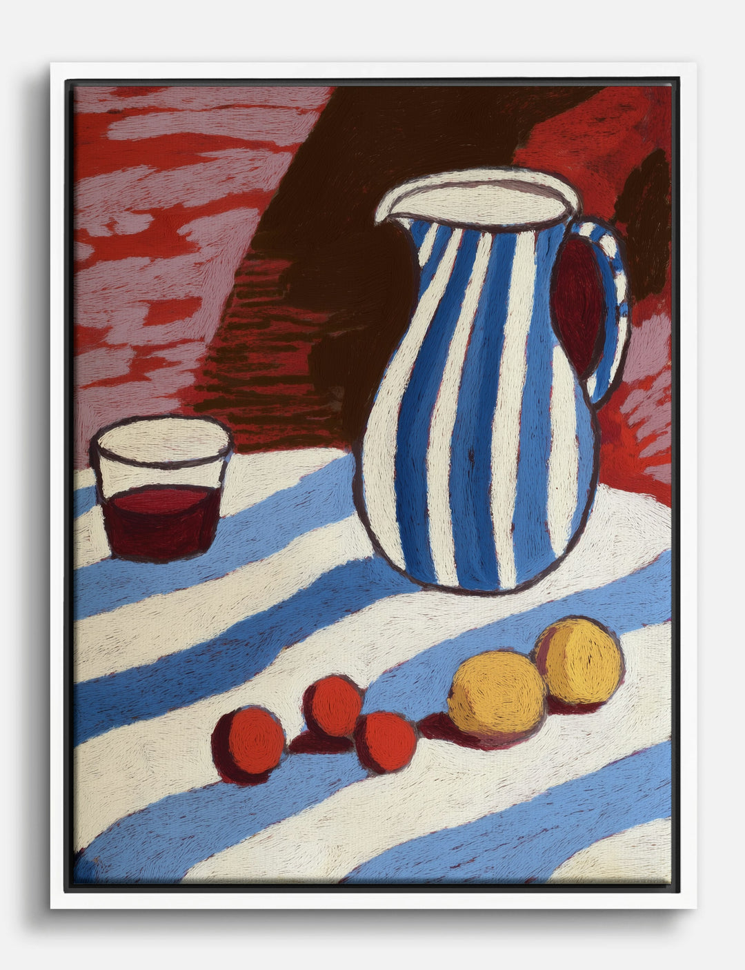 Bold stripes, playful color, and a dash of vintage charm—this piece instantly energizes any space. You’ll love how the blue-and-white pitcher and sunlit fruit pop against the swirling, painterly backdrop, bringing a sense of easygoing joy to your home.