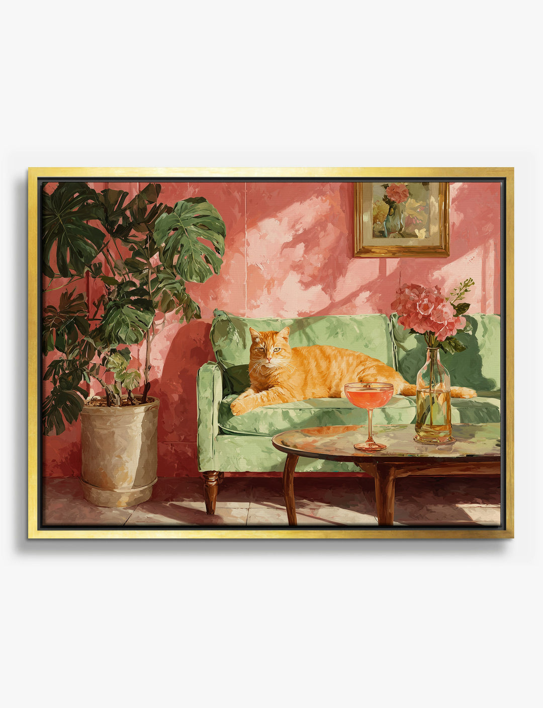 Sunlight, style, and a hint of playfulness—this print is pure mood. An amber tabby lounges in the center of a lush green sofa, surrounded by leafy houseplants and soft, rosy walls. It’s the kind of scene that instantly warms up your space, inviting you to slow down and soak up the good life. Perfect for your living room or bedroom, this piece brings cozy, effortless charm to any corner. The rich pinks and greens pop beautifully against both neutral and bold decor, making it easy to refresh your space with a single statement. You’ll love how this print sparks instant joy and a sense of sanctuary—proof that home can be both stylish and wonderfully relaxed. Let your walls tell a story that’s all about comfort and personal flair.