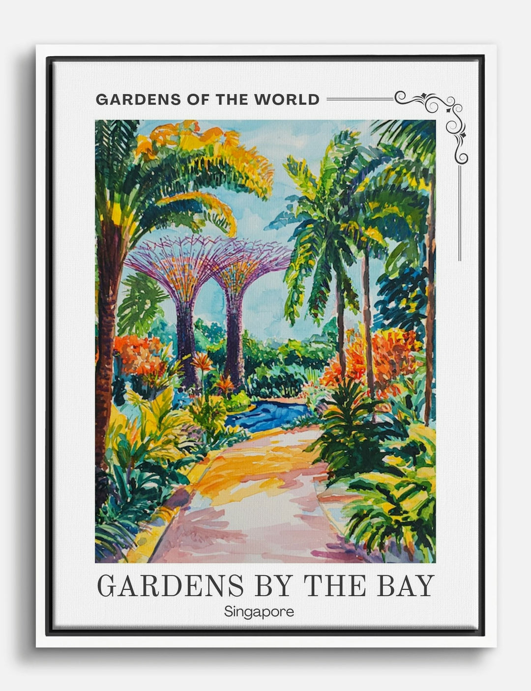 Step into a vibrant oasis with this lush depiction of Singapores Gardens by the Bay. Envision this colorful scene bringing a burst of tropical joy to your living room or office, where palm trees and bright florals invite a sense of adventure and relaxation. Let the vivid hues of green and orange energize your space, effortlessly complementing a variety of decor styles.