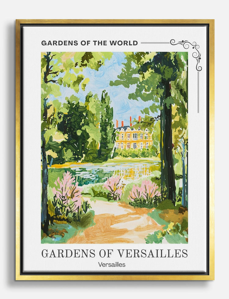Let the elegance of Versailles transform your space with this beautiful depiction of lush gardens and serene pathways. Perfect for your living room or office, this piece invites tranquility and sophistication. The vibrant greens and gentle yellows complement a variety of decor styles, infusing your home with a touch of classic charm and personal pride.