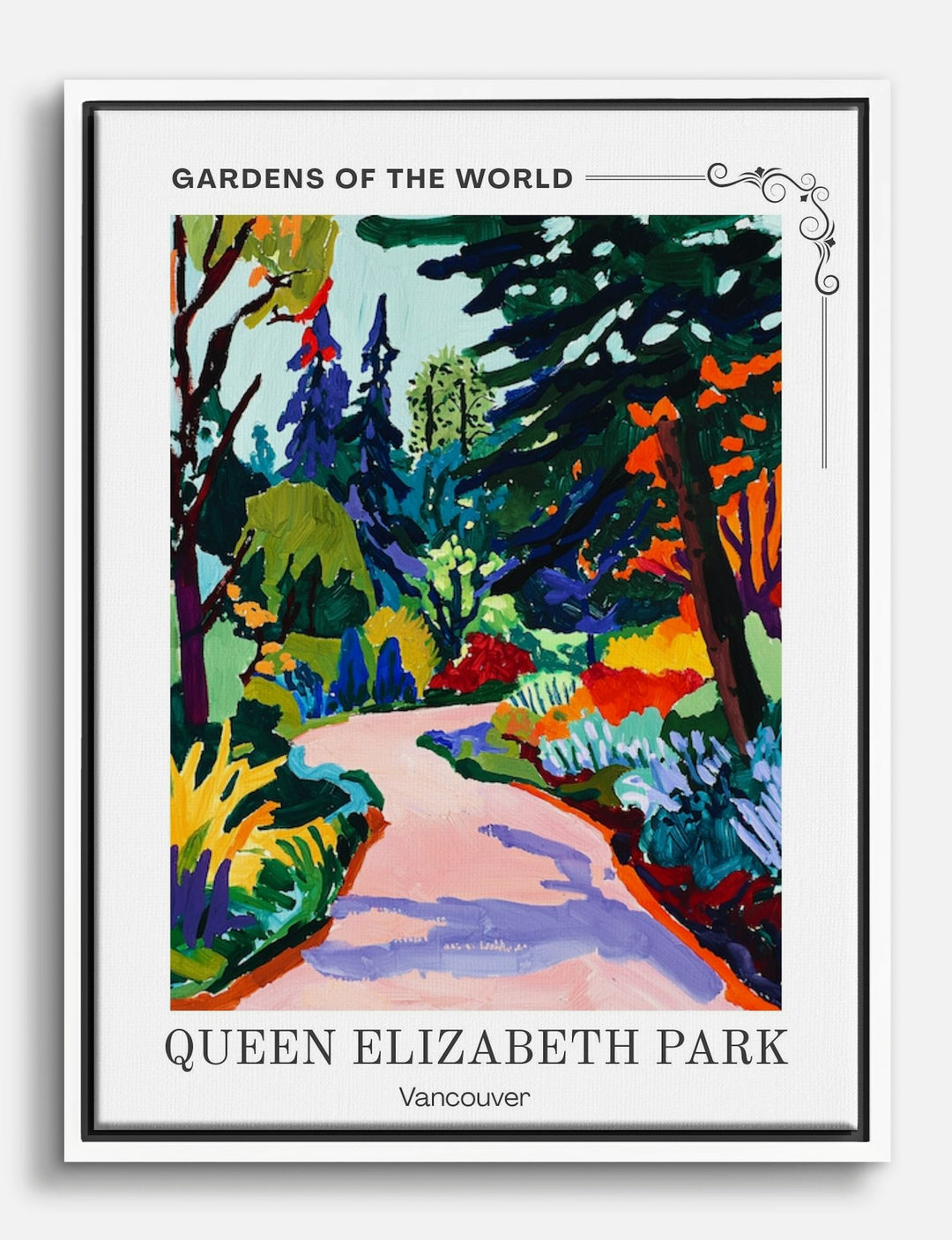Step into a world of color and serenity with this breathtaking depiction of Queen Elizabeth Park. The vibrant hues and lush greenery capture the essence of a perfect escape, right in your living room. Let this piece brighten your space and bring a touch of natures beauty into your home.