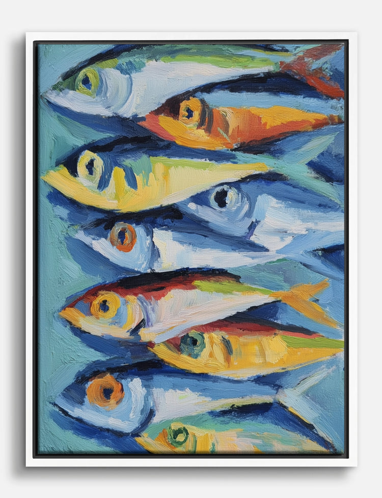 Bold colors and playful brushstrokes make these sardines impossible to ignore. This piece instantly energizes any room, inviting a sense of movement and creativity into your everyday space.
