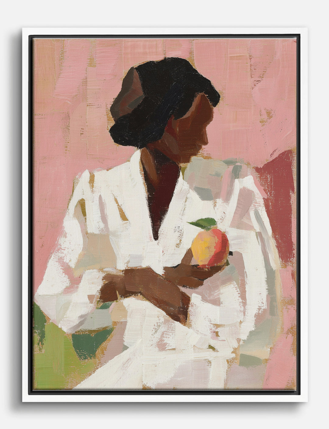 Bold brushstrokes meet soft, inviting hues in this modern portrait. The figure, wrapped in white, holds a peach with quiet confidence—an everyday moment elevated to art. The warm pinks and gentle greens create a soothing vibe that instantly adds warmth to any room.