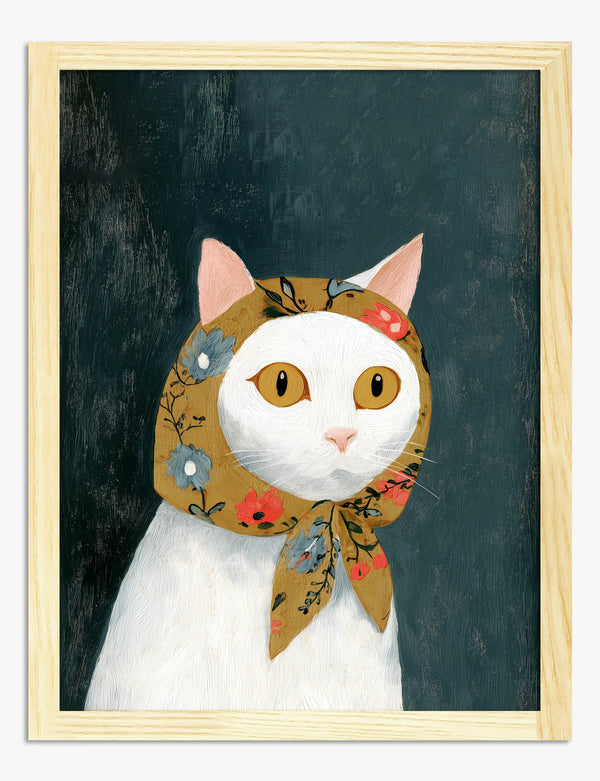 Poster ritratto di gatto bianco con foulard floreale vintage
