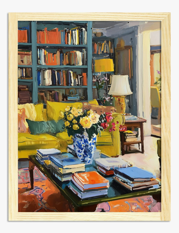 Poster salotto accogliente con librerie e divano giallo