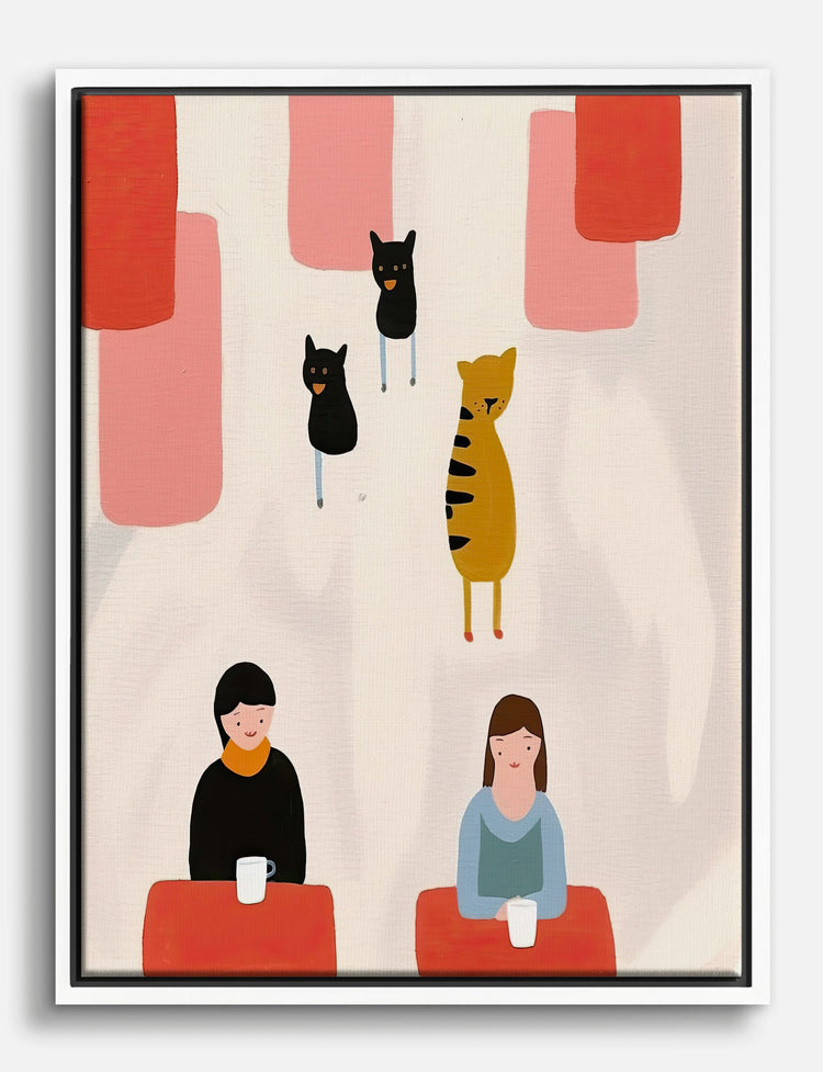 Two friends, a pair of warm mugs, and a trio of curious cats—this playful piece brings a pop of personality to your space. The soft blush and bold black tones create a cozy, inviting energy, perfect for sparking joy and conversation in your favorite corner.