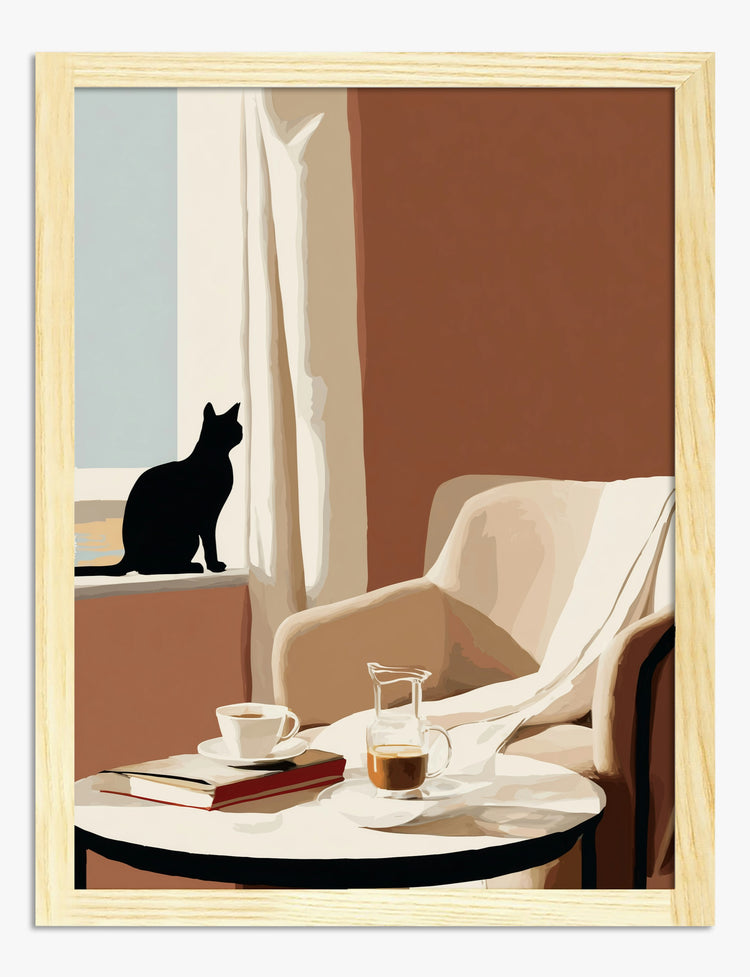Start your morning with a little magic—this cozy scene captures the quiet charm of a sunlit corner, complete with a curious cat and the simple pleasure of coffee. The warm, earthy palette instantly softens your space, making it feel both stylish and serene. Whether you hang it in your living room or create a reading nook in your bedroom, this piece brings an inviting, lived-in vibe that feels effortlessly chic. It’s the kind of art that makes you want to slow down and savor the details—like the gentle play of light, or the promise of a good book by your side. With neutral tones that blend beautifully with modern or minimalist décor, you’ll love how easy it is to elevate your space—no renovation needed. Let your walls tell a story of comfort, calm, and everyday joy.