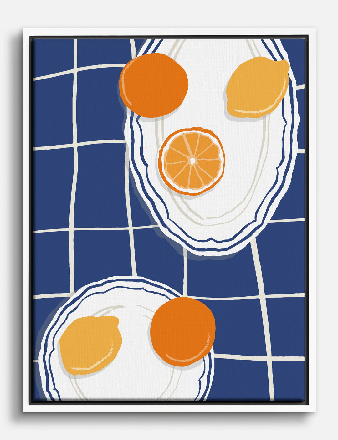 Fresh, fun, and effortlessly preppy — this piece instantly energizes your kitchen or dining space. The vibrant oranges and lemons pop against a playful navy grid, bringing a dash of modern charm to your walls.