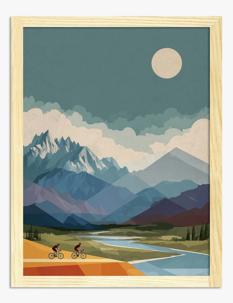 A rush of fresh mountain air, captured for your walls. This scene of two cyclists journeying beneath towering peaks and a soft, rising sun infuses your space with adventure and calm all at once. The layered blues and earthy golds blend seamlessly, bringing a soothing yet energizing vibe to your favorite room. Perfect for your living room or office, this piece inspires you to chase new horizons—whether youre working, relaxing, or simply dreaming of your next escape. It pairs beautifully with minimalist, modern, or rustic decor, making your space feel both welcoming and uniquely yours. Let your home reflect your sense of adventure—no bike required. This is style that feels bold, accessible, and entirely you.