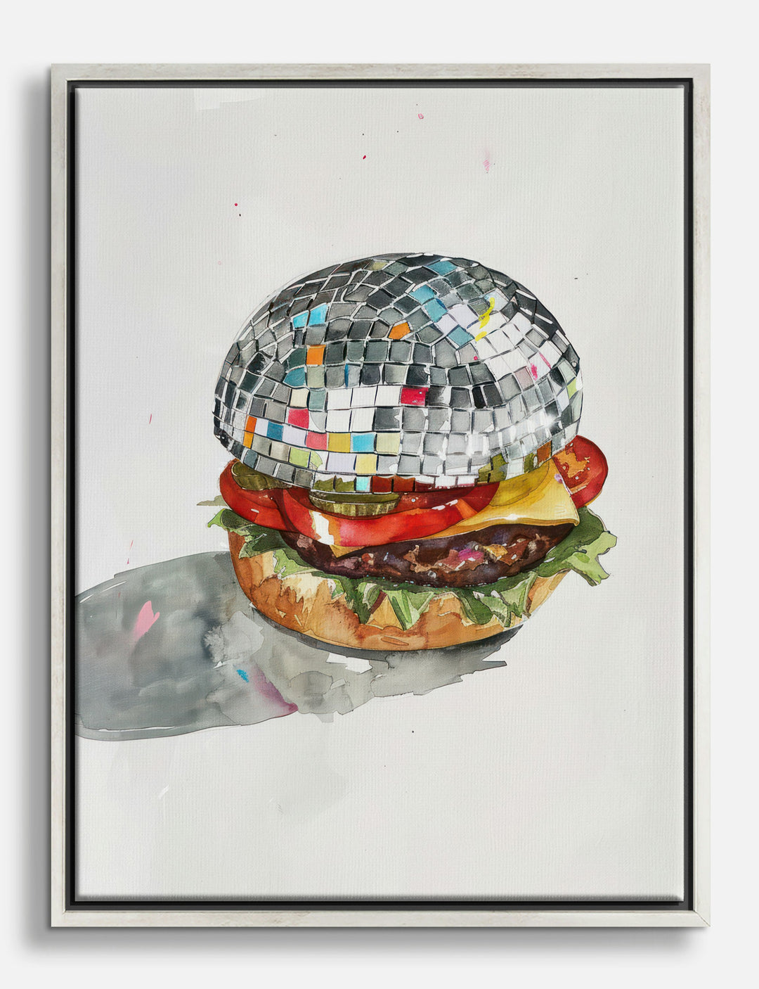 Who says food can’t be fabulous? This playful piece serves up a juicy burger topped with a shimmering disco ball bun, instantly turning your kitchen or dining area into the life of the party. The mix of lively colors and unexpected sparkle brings a dash of fun to your walls—perfect for anyone who loves bold style and a little tongue-in-cheek charm.