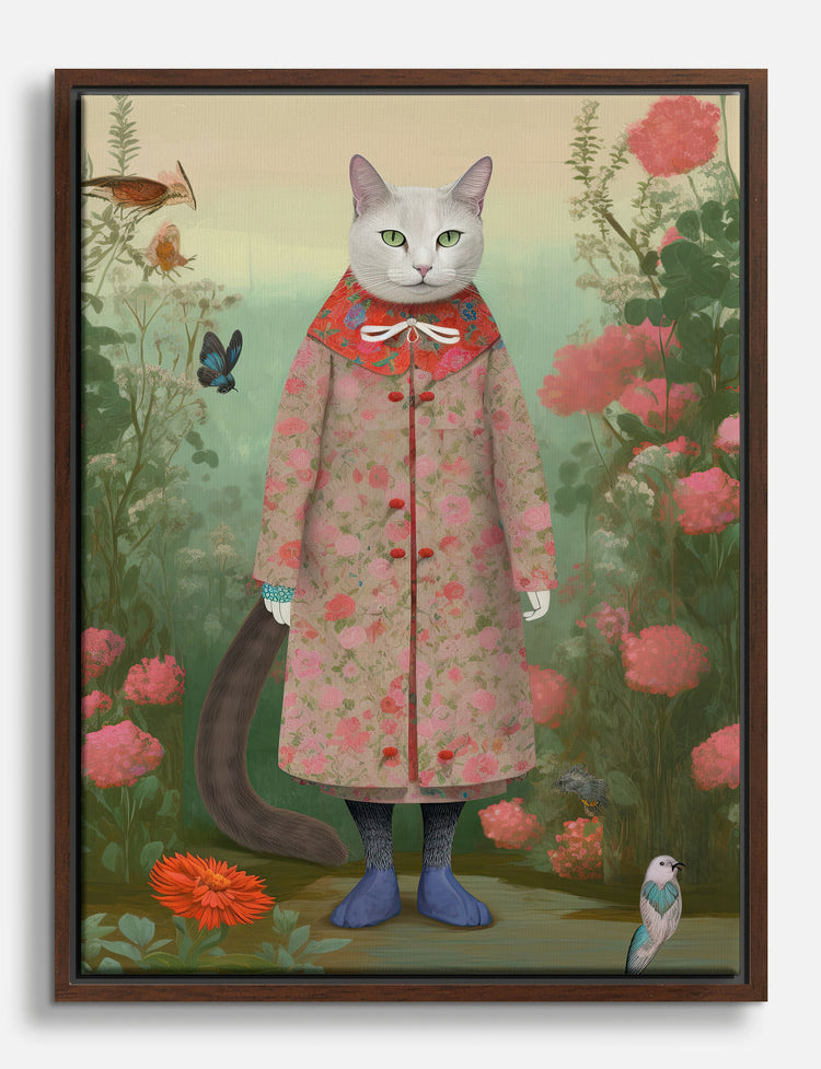 Step into a whimsical world where style meets imagination with this charming piece. A sophisticated cat in a floral coat stands amidst a lush garden, bringing a touch of elegance and playfulness to your space. Perfect for a cozy nook in your bedroom or a lively spot in the living room, this artwork’s pastel hues and delightful details effortlessly complement various decor styles. Let it inspire joy and creativity in your home, making every glance a moment of delight.