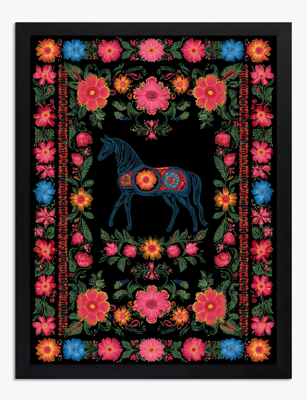 Bold color meets timeless tradition in this enchanting folk-inspired piece. Centered around a striking horse surrounded by vibrant blooms, it brings a joyful, storybook energy to your space. Let your living room or bedroom feel instantly more inviting—this artwork pops beautifully against both dark and light walls, making it a versatile style hero for your home. The lush reds, pinks, and blues add warmth and personality, while the intricate floral borders make every glance a delight. Youll feel a sense of pride and creative flair every time you pass by. Its a statement that says your space is truly, uniquely yours—no renovation required.