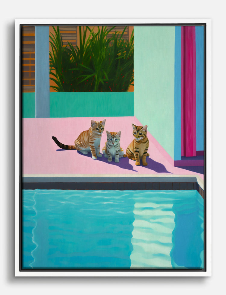 Sunshine, stripes, and a dash of playful curiosity—this piece brings pure charm to your space. Three kittens gather by a serene aqua pool, ready to spark a smile every time you pass by.