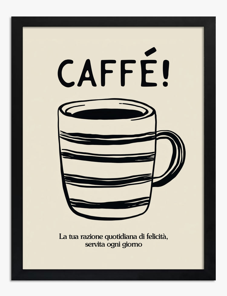 Start your day with a little Italian flair—this playful coffee illustration brings instant warmth and style to your space. The bold, hand-drawn mug and inviting “CAFFÉ!” headline make every morning feel like a cozy café moment, right at home. Perfect for kitchens, breakfast nooks, or your favorite coffee corner, this piece pops against both neutral and colorful backdrops. The simple black and beige palette blends effortlessly with modern, minimalist, or eclectic decor, letting your personality shine through. Let this art be your daily reminder: happiness is served fresh, one cup at a time. Make your home feel more welcoming, more you—with a touch of Italian charm that sparks joy every day.