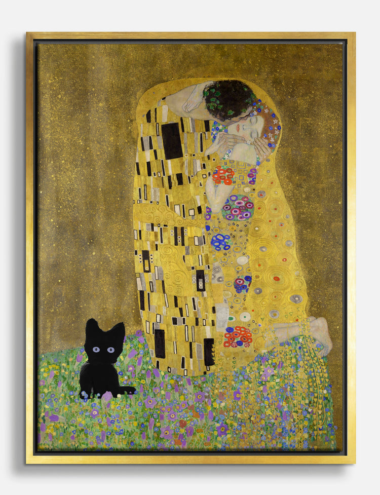 A cascade of gold and romance wraps your space in pure magic—now with a playful twist. Klimt’s iconic lovers share their embrace, while a curious black cat adds a dash of whimsy that’s impossible not to smile at. This piece transforms any room into a gallery of warmth and personality, effortlessly complementing modern or eclectic decor with its rich golds and pops of color. Hang it where you unwind—your living room or bedroom—and let your style shine with pride.