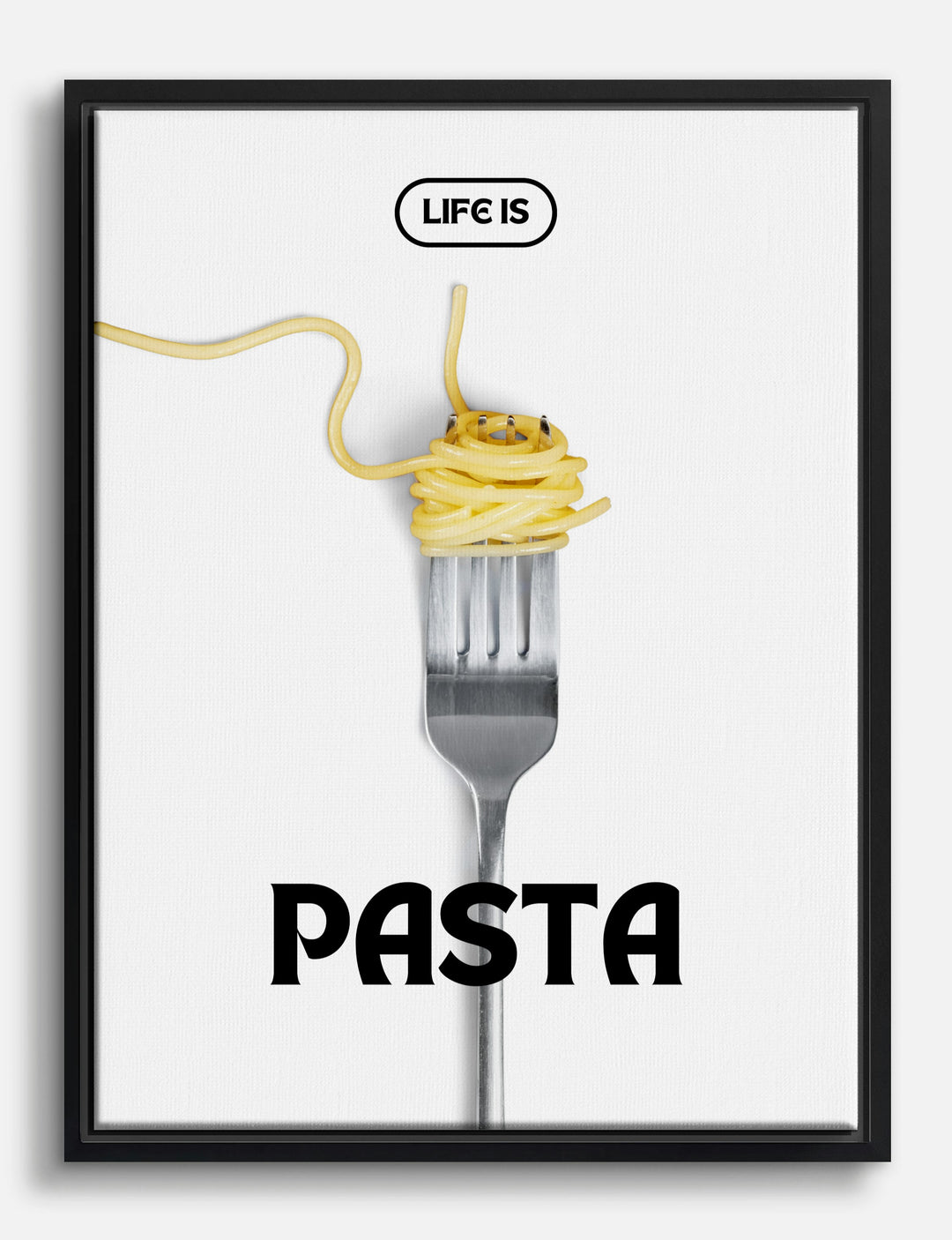 A playful swirl of spaghetti on a fork sets the tone for a kitchen that radiates joy and personality. With bold black typography and crisp white space, this piece celebrates the simple pleasure of a good meal and the little moments that make life flavorful.