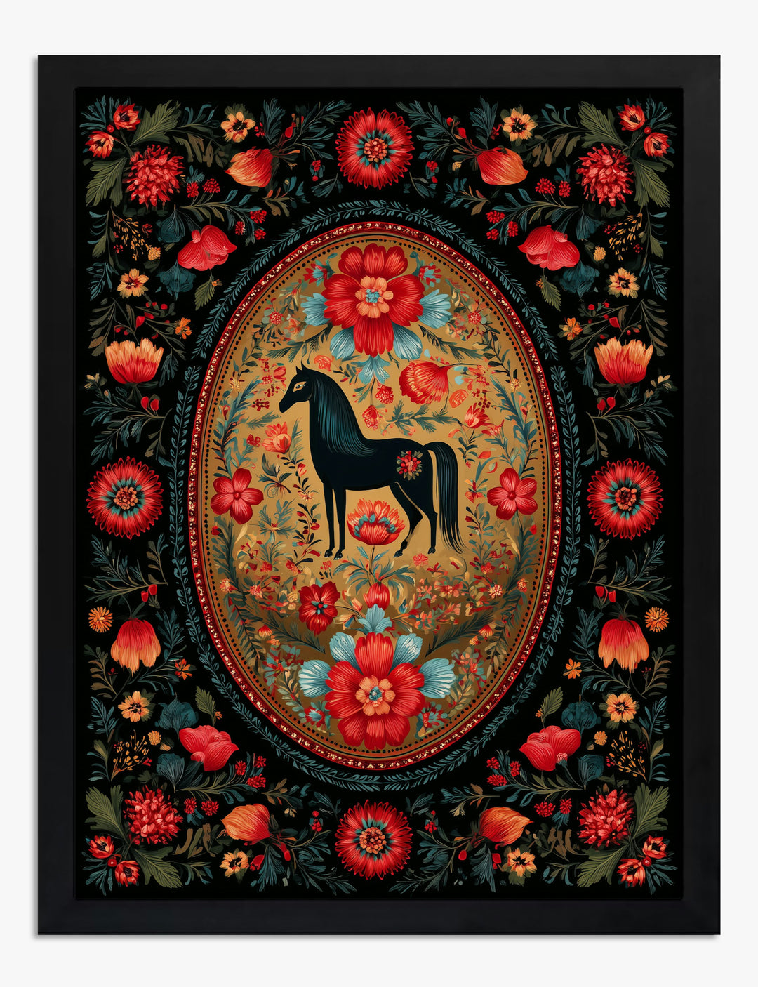 Bold, folkloric beauty takes center stage with this enchanting horse surrounded by a riot of vivid blooms. Instantly, your space feels both storied and alive, as if you’ve uncovered a treasured heirloom with a modern twist. This piece radiates warmth and artistry, making it perfect for your living room or bedroom—anywhere you want to spark conversation and admiration. The deep blacks and lush reds pop against neutrals and add drama to both cozy and contemporary settings. Let your home feel uniquely yours—unexpected, expressive, and full of pride. With this print, transforming your space is effortless and unforgettable.