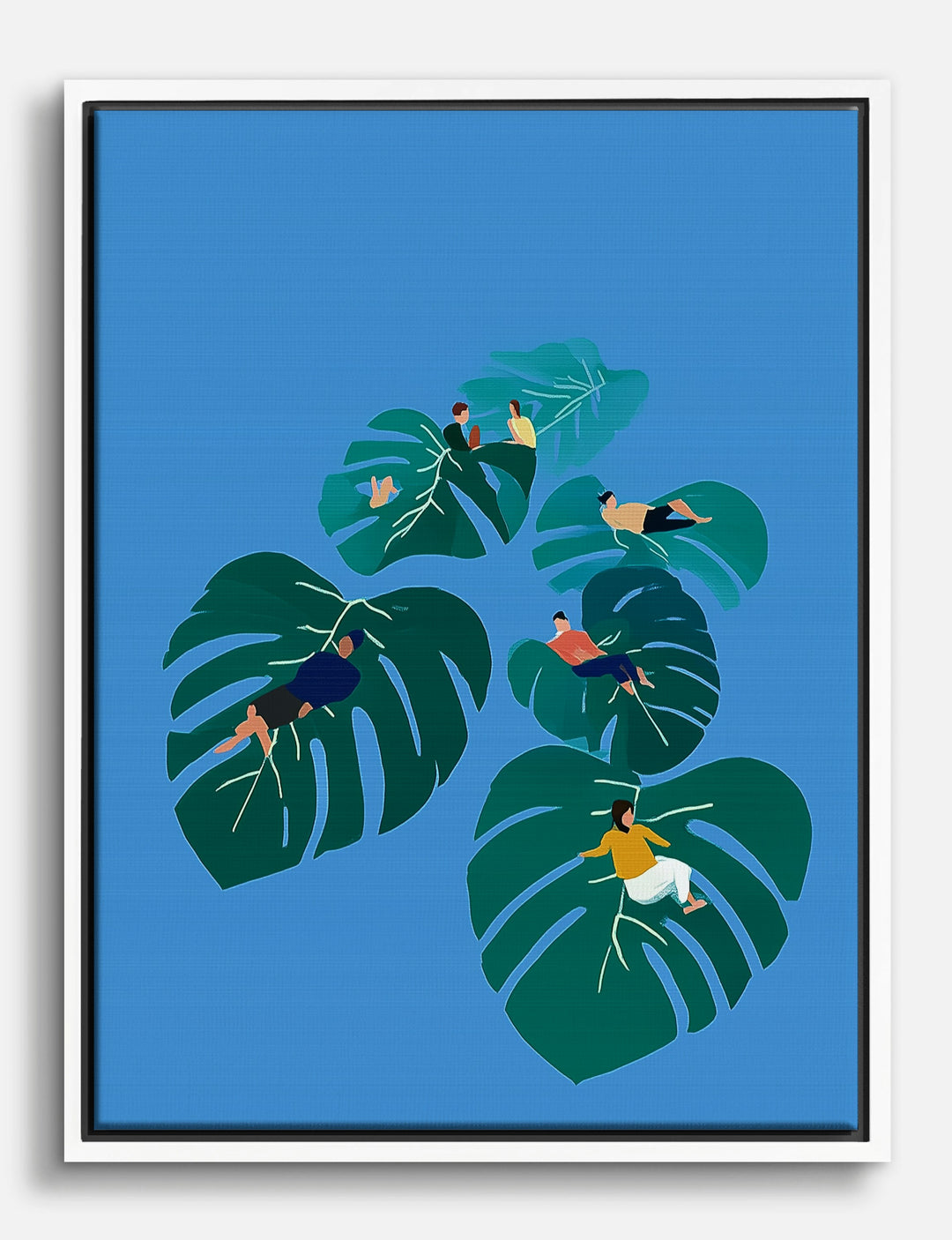 Like a secret garden getaway, this playful piece invites you to drift on oversized monstera leaves, alongside a cast of tiny, relaxed figures. The lush greens pop against a crisp blue sky, giving your space a breezy, uplifting vibe that feels both fresh and fun.
