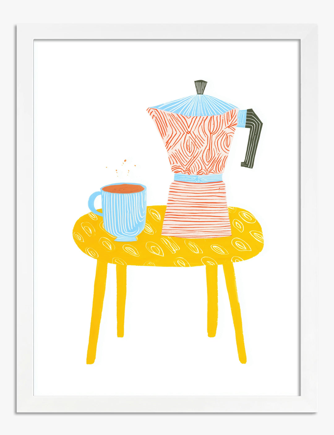 Start your day with a burst of color and a dash of charm. This playful illustration captures the simple joy of a fresh cup of coffee, turning an everyday moment into a mini celebration. The bold yellow table and whimsical patterns make it feel like sunshine has pulled up a seat at your breakfast nook. Perfect for kitchens or dining rooms, this piece energizes your space with its bright palette and approachable style. Whether your decor is modern, eclectic, or just in need of a cheerful pop, youll love how effortlessly it transforms your walls. Let this print remind you that joy can be found in the little rituals—and that great style is always within reach.